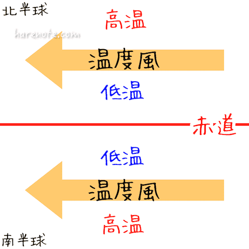 東風成分をもつ温度風は、北半球でも南半球でも、「高緯度側が相対的に高温」ということになります。