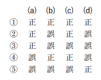 発達した台風の一般的な特徴について述べた次の文(a)~(d)の正誤の組み合わせとして正しいものを、下記の①~⑤の中から1つ選べ。