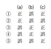 台風によって発生する災害に関連する事項について述べた次の文(a)~(c)の正誤の組み合わせとして正しいものを、下記の①~⑤の中から1つ選べ。