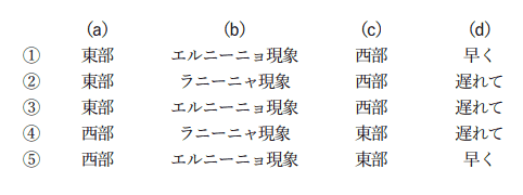 ③ (a)東部, (b)エルニーニョ現象, (c)西部, (d)遅れて