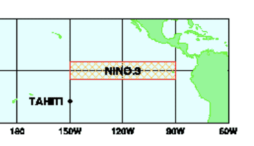 エルニーニョ監視海域は北緯5度から南緯5度、西経150度から西経90度の領域。↓