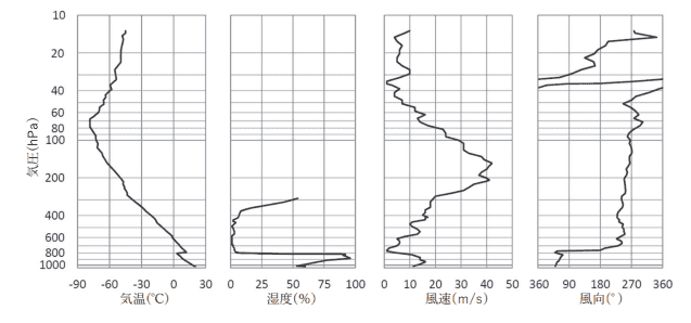 (b) 下図から対流圏界面の高さを推定すると、気温の分布から80hPa付近に1つめの圏界面があり、風向風速の分布から40hPa付近に2つめの圏界面があると推定される。