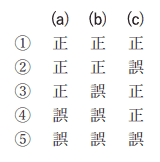 図は、春のある日の9時の天気図(上図)と、この天気図に示したA、B、Cのいずれかの観測点におけるラジオゾンデで観測した気温、湿度、風速、風向の鉛直分布図(下図)である。これらの鉛直分布図について述べた次の文(a)~(c)の下線部の正誤の組み合わせとして正しいものを、下記の①~⑤の中から1つ選べ。