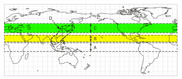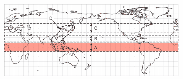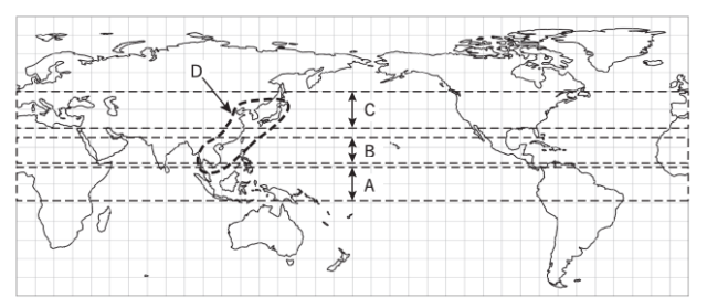 図に示す破線で囲まれたA〜Dの領域における風や降水量、熱輸送量の特徴について 述べた次の文(a)〜 (c)の正誤の組み合わせとして正しいものを、下記の①〜⑤の中から 1 つ選べ。