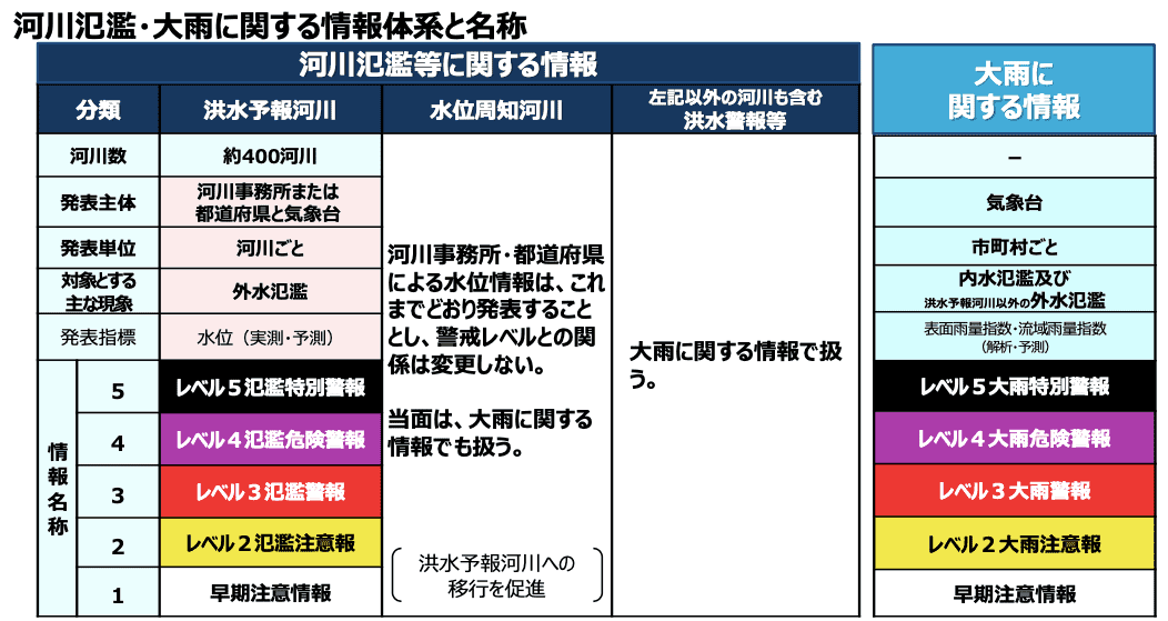 これまでの「洪水警報」はなくなり、大雨の予報・警報と一本化。