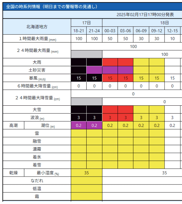 - 特別警報・警報・注意報: 暴風、波浪、大雪、暴風雪