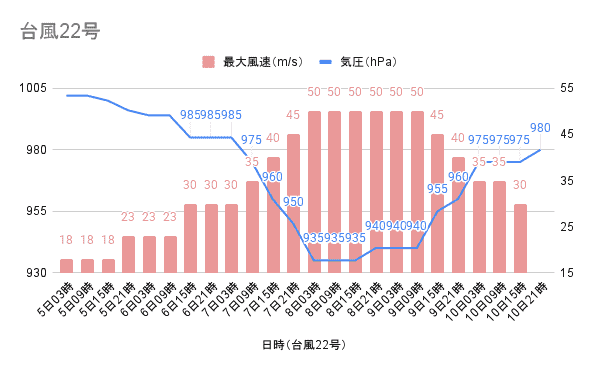 | 台風 22 号 (接近) | Halong ハーロン | 湾の名前 (ベトナム) | 10/3 | 10/5 | 10/10 | 小笠原諸島付近に発生した低気圧が発達し、小笠原近海で台風22号となりました。台風22号は発達しながら概ね西北西に進み、8日には急速に発達し、非常に強い勢力を保ったまま9日朝にかけて伊豆諸島に最も接近した。9日朝に東京都伊豆諸島に大雨特別警報を発表。伊豆諸島では、多い所で 24時間降水量が 300 ミリを超える記録的な大雨と なった。 | 935hPa | 50m/s |