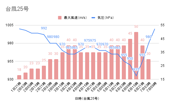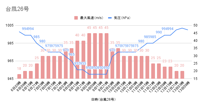 | 台風 26 号 (接近) | Fung-wong フォンウォン | 山の名前(フェニックス) (香港) | 11/3 | 11/6 | 11/13 | マリアナ諸島付近に発生した低気圧が台風26号となり、西北西に進んだ。台風26号は、台風25号(カルマエギ)の直後にフィリピン、台湾、および日本の南西諸島に影響を与え、甚大な被害をもたらした。フィリピンでは広範囲で洪水や土砂崩れが発生し、少なくとも27人が亡くなり、36人の負傷者が出た。台湾では台風の通過に伴い、少なくとも95人が負傷。また、沖縄県の先島諸島や本島地方に最接近し、警報級の大雨となった。台風の影響による大雨で、東村や沖縄市などで1時間に30ミリを超える激しい雨が観測された。 八丈島では記録的な暴風雨を観測し、停電や断水、道路の通行止めなどの被害が出ました。台風26号は13日に宮古島の北西約80kmで温帯低気圧に変わった。 | 950hPa | 45m/s |