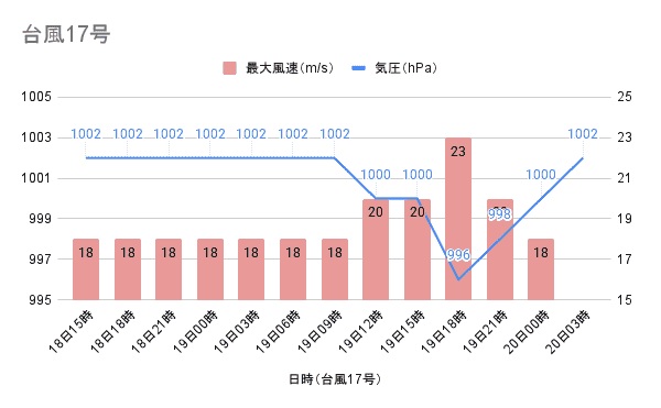 | 台風 17 号 | Mitag ミートク | 女性の名前 (ミクロネシア) | 9/16 | 9/18 | 9/20 | フィリピンの東で発生した熱帯低気圧が北西に進み、東シナ海で台風となった。台風17号はそのまま北西に進み、華南で熱帯低気圧に変わった。 | 996hPa | 23m/s |