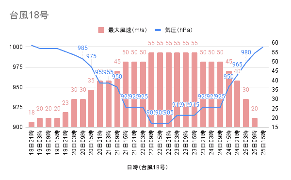 | 台風 18 号 | Ragasa ラガサ | 動きを速めること (フィリピン) | 9/16 | 9/18 | 9/25 | フィリピンの東からマリアナ諸島付近に存在した低圧部が徐々にまとまり、17日に熱帯低気圧となった。この熱帯低気圧は発達しながら西北西に進み、18日にフィリピンの東出台風となった。その後バシー海峡を通り、南シナ海へ進み、華南に上陸し熱帯低気圧に変わった。 | 905hPa | 55m/s |