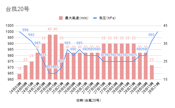 | 台風 20 号 | Bualoi ブアローイ | お菓子の名前 (タイ) | 9/20 | 9/24 | 9/29 | 20日ごろからカロリン諸島付近にあった低圧部が、22日には熱帯低気圧となり、24日に台風となった。台風20号は発達しながら西北西に進み、フィリピンに上陸、一旦勢力が弱まった後、南シナ海で再び勢力を強め、ベトナムに上陸。ラオスで熱帯低気圧に変わった。 | 965hPa | 40m/s |