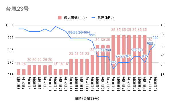 | 台風 15 号 (上陸) | Peipah ペイパー | 魚の名前 (マカオ) | 8/29 | 9/4 | 9/5 | カロリン諸島付近で発生した低気圧が徐々に発達しながら北西に移動したのち、やや東寄りに進路を変え、2日には熱帯低気圧となった。その後、4日に奄美大島の東で台風となり、九州の南を通って、四国、紀伊半島に上陸。静岡県では、台風第15号の影響で線状降水帯による非常に激しい雨が降り続き、また竜巻等の突風により、県内各所で人的・物的被害が発生した。 | 992hPa | 23m/s |
