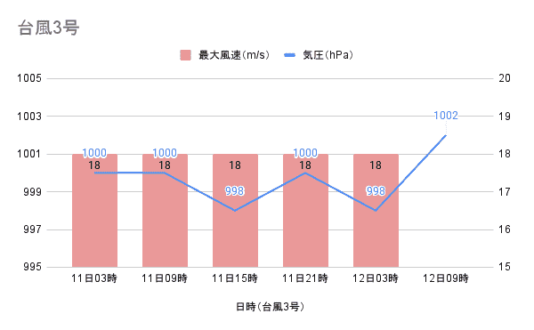 | 台風 3 号 | Nuri ヌーリ | オウム (マレーシア) | 3/5 | 3/11 | 3/12 | フィリピンの東で台風3号発生し、やや南下し、再び熱帯低気圧に変わった。 | 998hPa | 18m/s |